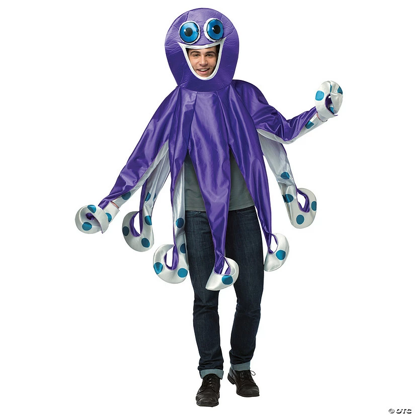 Octopus Adult Costume. Take a swim under the sea with your fishy friends. Includes: Poly-foam over-the-head tunic that looks like a lively purple octopus with long tentacles and a large smiling face that has a cut out in the mouth for a face opening. Two of the tentacles double as sleeves and the underside of the octopus is white and detailed with blue polka dots. Available Sizes: One size fits most chest sizes 48-52 in.Special Shipping Information: This item ships separately from other items in your order. This item cannot ship to a P.O. Box. This item may be subject to additional processing days.ITEM IS NOT ELIGIBLE FOR EXPEDITED SHIPPING