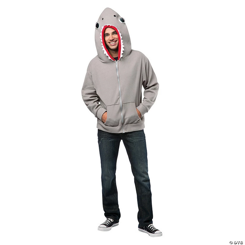 Da dum, da dum, da dum! Throw on this comfortable shark hoodie and you can hum that infamous theme song all night! Made from cotton and polyester, this super soft grey hoodie features a front zipper and pointed hood with black shark eyes and a red lined face opening rimmed with white teeth! This adult shark hoodie makes a fast and easy costume or is perfect for everyday wear.