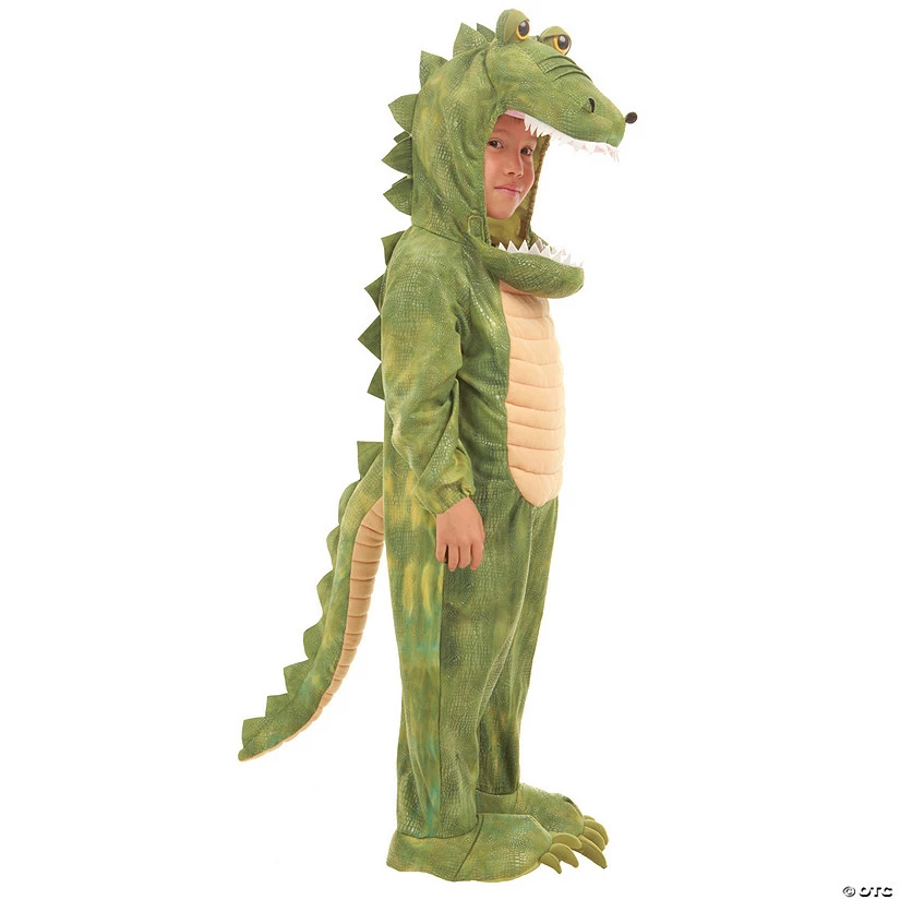 Your child will be the most adorable alligator in this cute costume! Includes a one piece jumpsuit with velcro strip along left side of belly for easy wearing an attached hood that has a soft-sculpted snout with plastic eyes fabric spikes and a stuffed tail sewn to back of suit. Elastic at wrists and under foot of shoe covers for a secure fit. 100% polyester. Care instructions: Spot clean only. Colors may blend. Do not twist or wring. Reshape and dry flat. Do not dry clean or bleach.Special Shipping Information: This item ships separately from other items in your order. This item cannot ship to a P.O. Box. This item may be subject to additional processing days. ITEM IS NOT ELIGIBLE FOR EXPEDITED SHIPPING