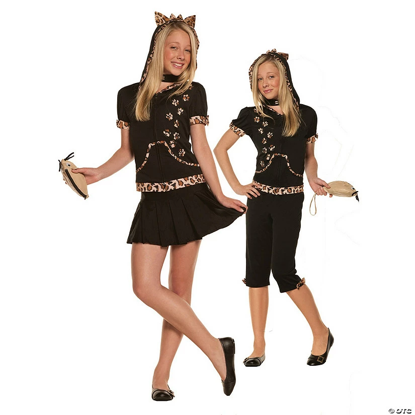 Hoodie with cat ears attached, capri pants, skirt, detachable tail, collar and mouse purse.